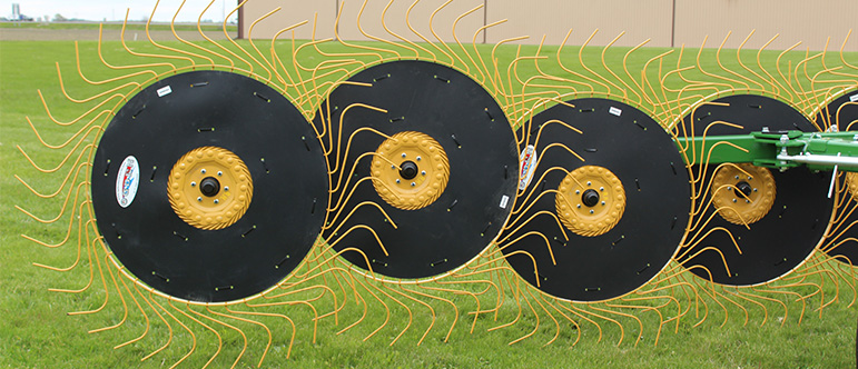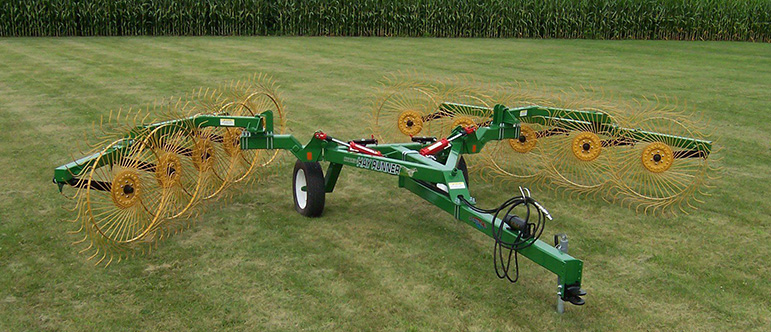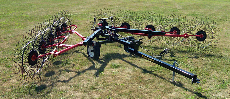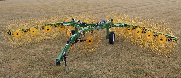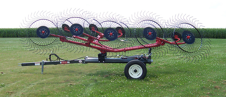 This rake comes as an 8-wheel, 10-wheel, or 12-wheel rake. This newer model rake offers a simple design and ease of use! Its center wheel kit on the front tongue of the rake prevents hay from bailing up in the back of the rake when raking a high volume of hay.